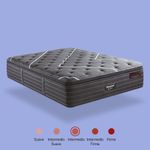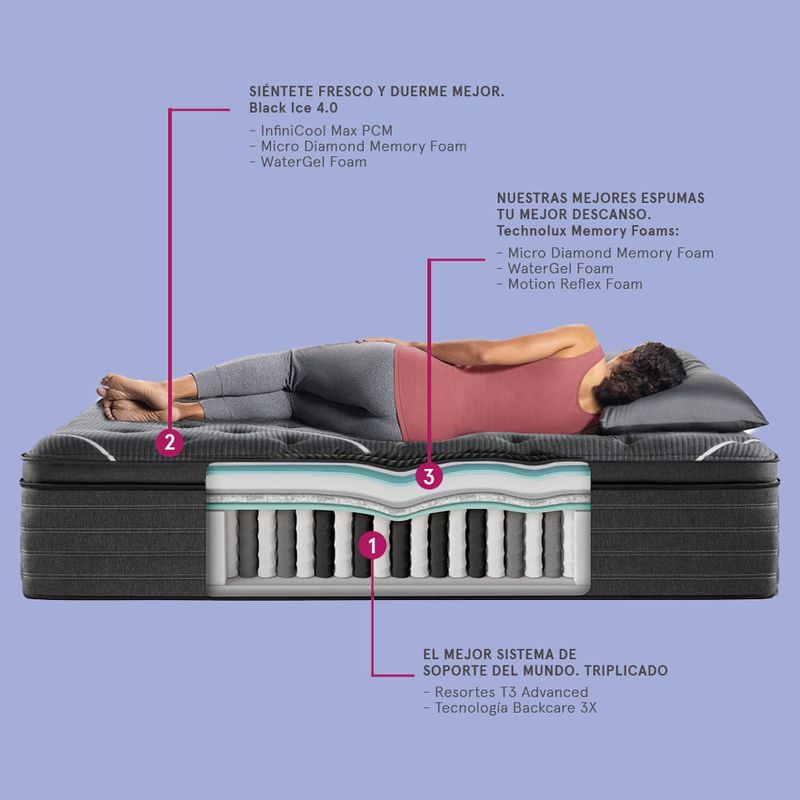 Ofrece una experiencia de descanso exclusiva con firmeza intermedia y soporte reforzado de doble capa. Su sistema de resortes independientes de triple acero con nanoresortes brinda estabilidad y adaptabilidad, mientras el Pillow Top envolvente de espumas premium aporta suavidad acogedora. Incorpora tela fría al contacto y espumas con partículas de plata para frescura superior, higiene y protección antibacterial y antiviral, con acabados de lujo y bordes reforzados.
